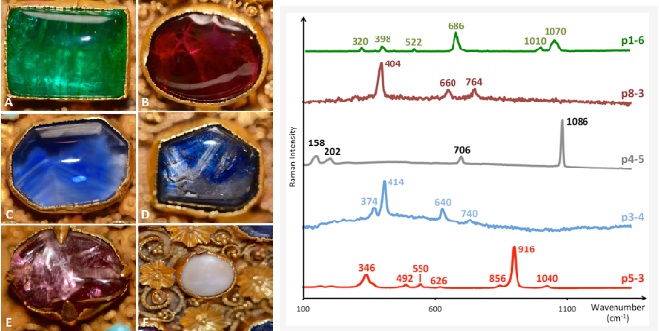 In a Raman spectrometer, a narrow laser beam of infrared or visible light is directed at a material. Most of it is scattered at the same wavelength, but a small amount is at a different wavelength. This difference is displayed on a screen or chart as a diagnostic series of peaks, which can be referred to as a database to identify the material, though it is not usually possible to distinguish between natural and synthetic stones. Sophisticated instruments can be used to identify inclusions, which do not have to reach, though they should be near the surface of a stone.