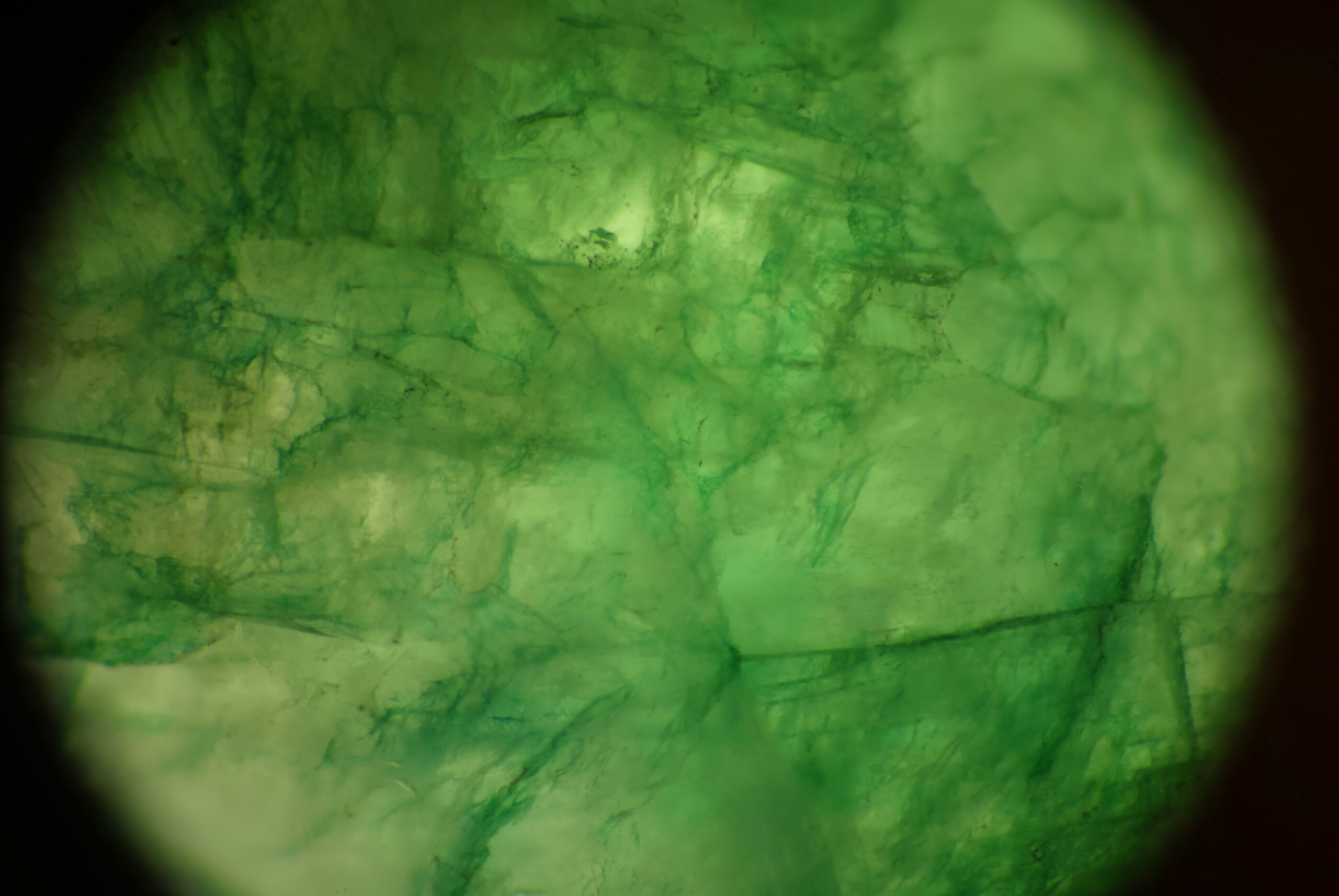 Most green jadeite has a chrome spectrum, of which it is usually possible to see fine lines in the red. Dyed green jadeite may have a broad band in the red or three broad bands in the red to orange, but it does not have fine lines in the red.